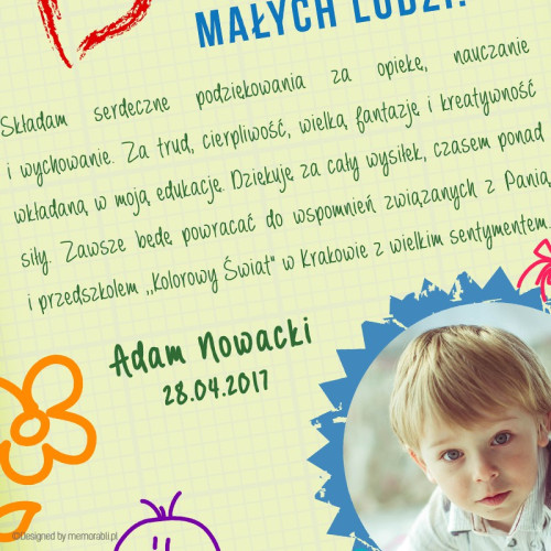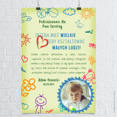 Plakat może zostać dostosowany (treść oraz data) do okazji, podczas której zostanie wręczony (dzień nauczyciela, zakończenie roku szkolnego lub inna).