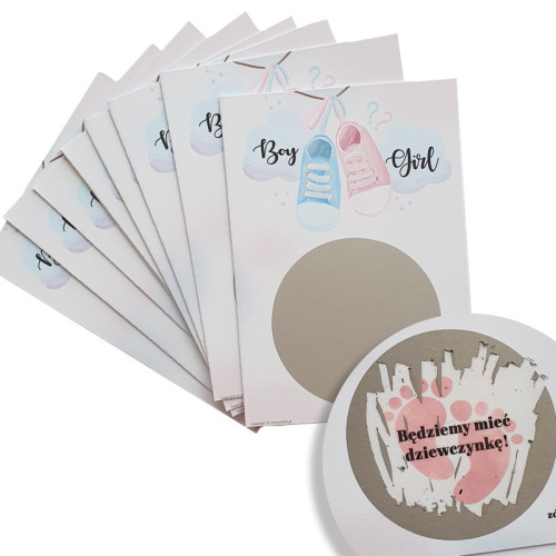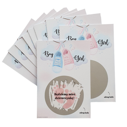 Przekaż cudowną wiadomość najbliższym w oryginalny sposób. Będziemy mieć dziewczynkę! Kartka bez dodatkowej personalizacji. Zestaw 10 bilecików ze zdrapkami.