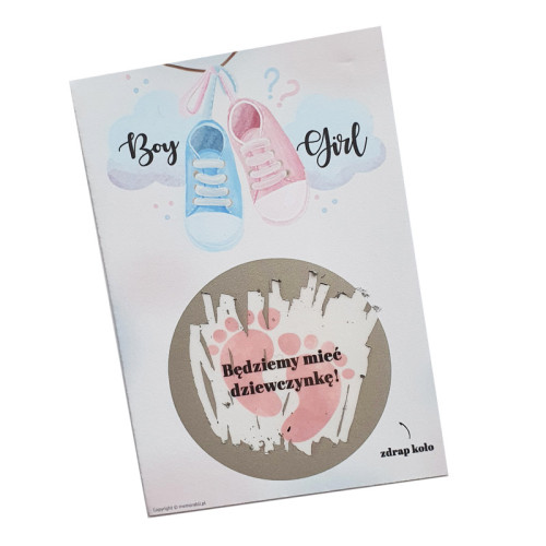 Pod zdrapką została ukryta grafika różowych stópek dziecka z napisem "Będziemy mieć dziewczynkę".