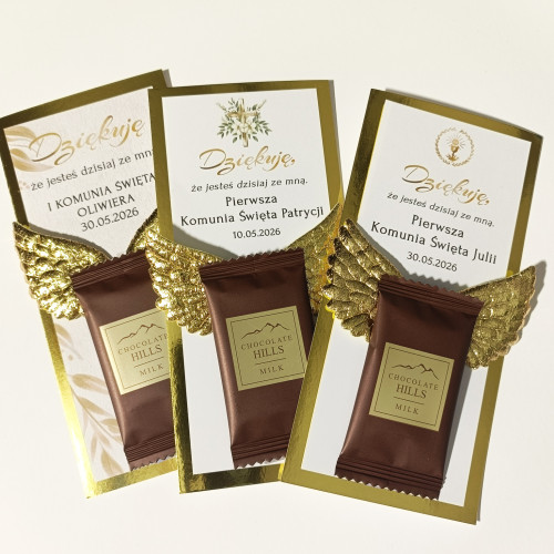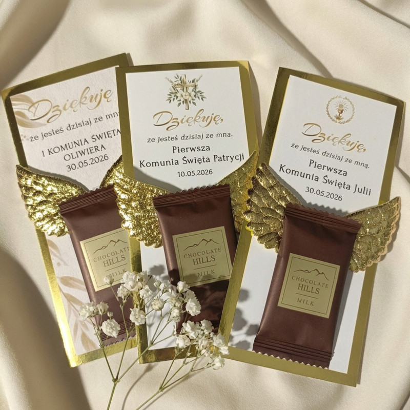Podziękowanie Upominek dla gości z czekoladkami KOMUNIA złote skrzydła