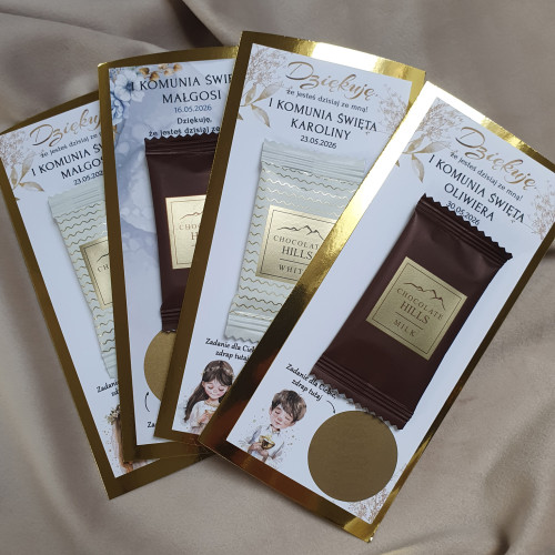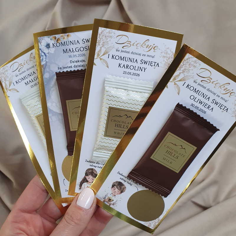 Zamień komunijne przyjęcie w pełne śmiechu, radości i wspólnej zabawy spotkanie! Personalizowane zdrapki z zadaniami to oryginalna atrakcja dla dzieci i dorosłych, która integruje gości, wywołuje uśmiech i tworzy piękne wspomnienia. Jednocześnie podziękowanie z pyszną czekoladką.
