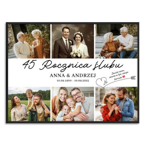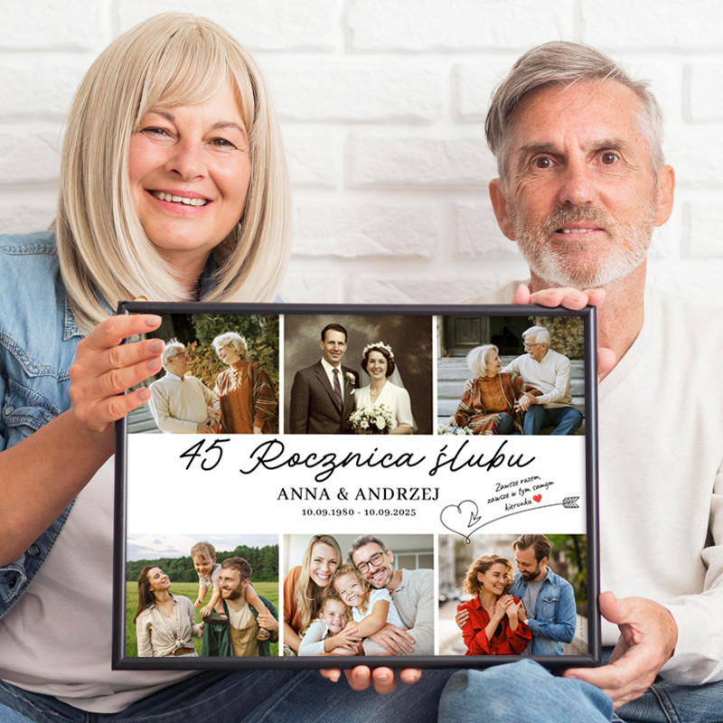 Bestseller, plakat z ramką w formacie A3 (30x40cm) . Spersonalizowany plakat w formie kolażu ze zdjęciami na rocznicę ślubu to doskonały pomysł na prezent dla rodziców, przyjaciół, dziadków lub innych bliskich osób, którzy właśnie świętują swój jubileusz. Tajemnica elegancji tkwi w prostocie. Wzór pasuje do każdego wnętrza, dla pary w każdym wieku.