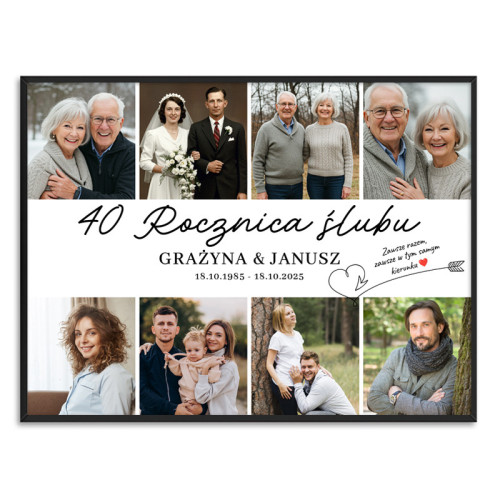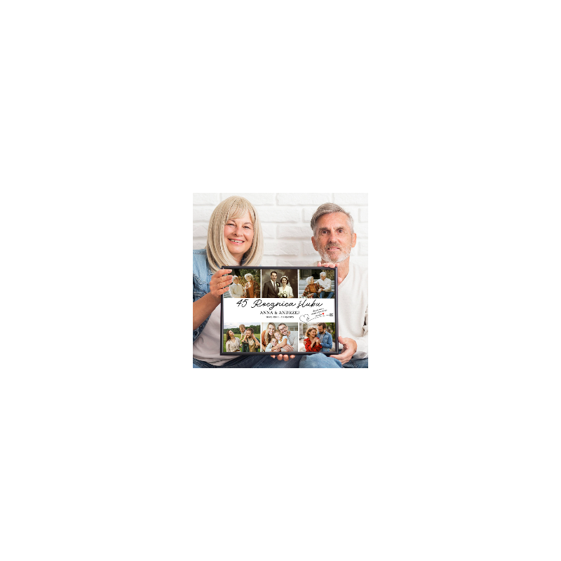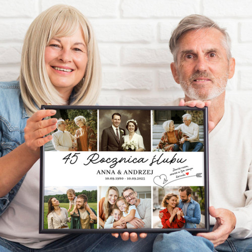 Spersonalizowany plakat w formie kolażu ze zdjęciami na rocznicę ślubu to doskonały pomysł na prezent dla rodziców, przyjaciół, dziadków lub innych bliskich osób, którzy właśnie świętują swój jubileusz. Tajemnica elegancji tkwi w prostocie. Wzór pasuje do każdego wnętrza, dla pary w każdym wieku.