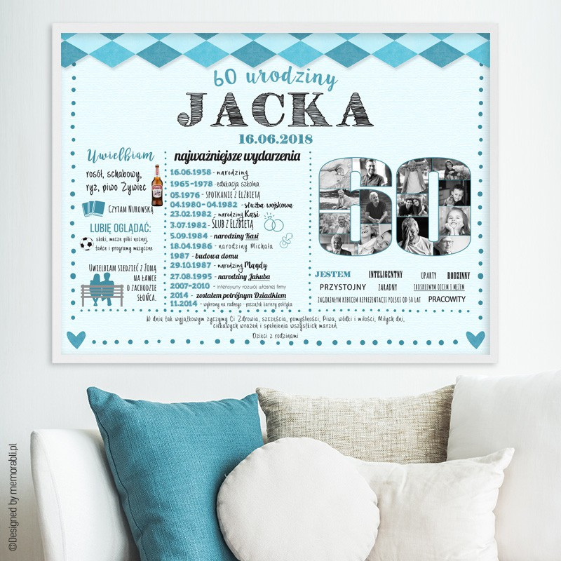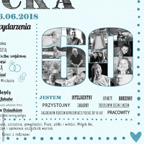 Plakat na dowolne urodziny! Zdjęcia mogą być w komponowane w dowolną liczbę. Ze względu na sporą ilość informacji oraz zdjęcia sugerujemy zamówić rozmiar 30x40cm. Możliwa zmiana kolorystyki plakatu.
