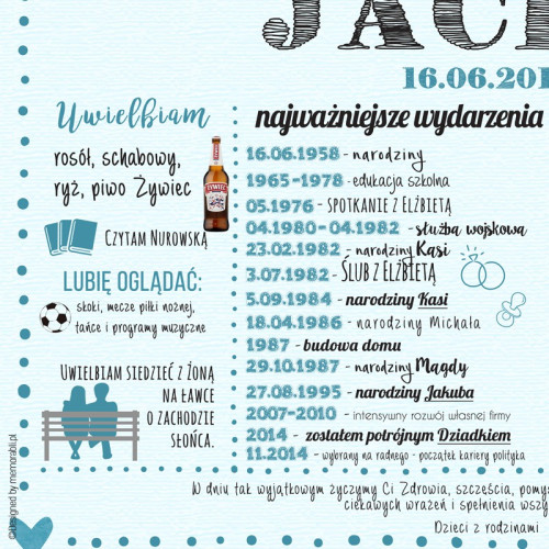 Prezentowana grafika jest w pełni personalizowalna! Oznacza to, że na wydruku znajdą się podane przez Ciebie informacje i oraz przesłane przez Ciebie zdjęcia. Jakie dane umieścimy na plakacie? Cokolwiek chcesz, jednak aby Ci ułatwić zadanie kilka podpowiedzi znajdziesz w polu obok "DOSTOSOWYWANIE PRODUKTU". Zdjęcia do plakatu prosimy wysłać na adres email: zamowienia@memorabli.pl