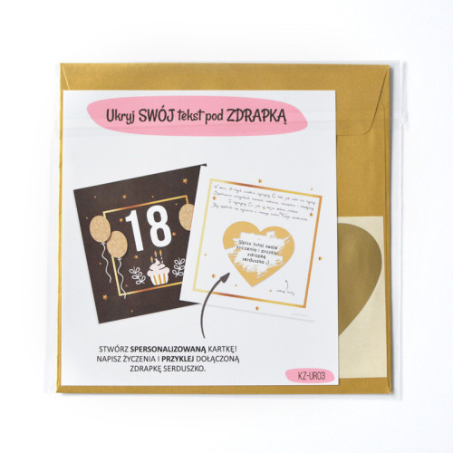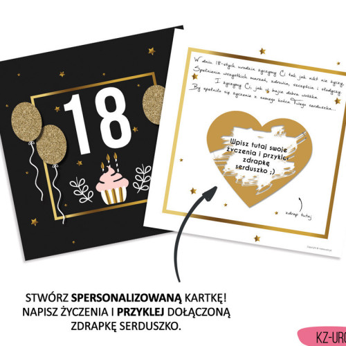 W wyznaczonym miejscu umieść swój tekst np. życzenia, informację o prezencie, a następnie przyklej dołączoną zdrapkę w kształce serduszka.
