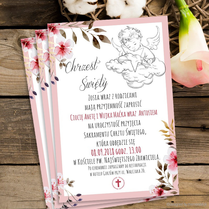 Ramka Różowa Z Kwiatami i aniołkiem - zaproszenie na chrzest