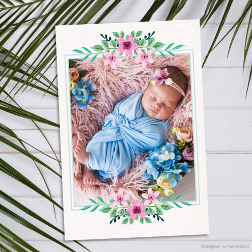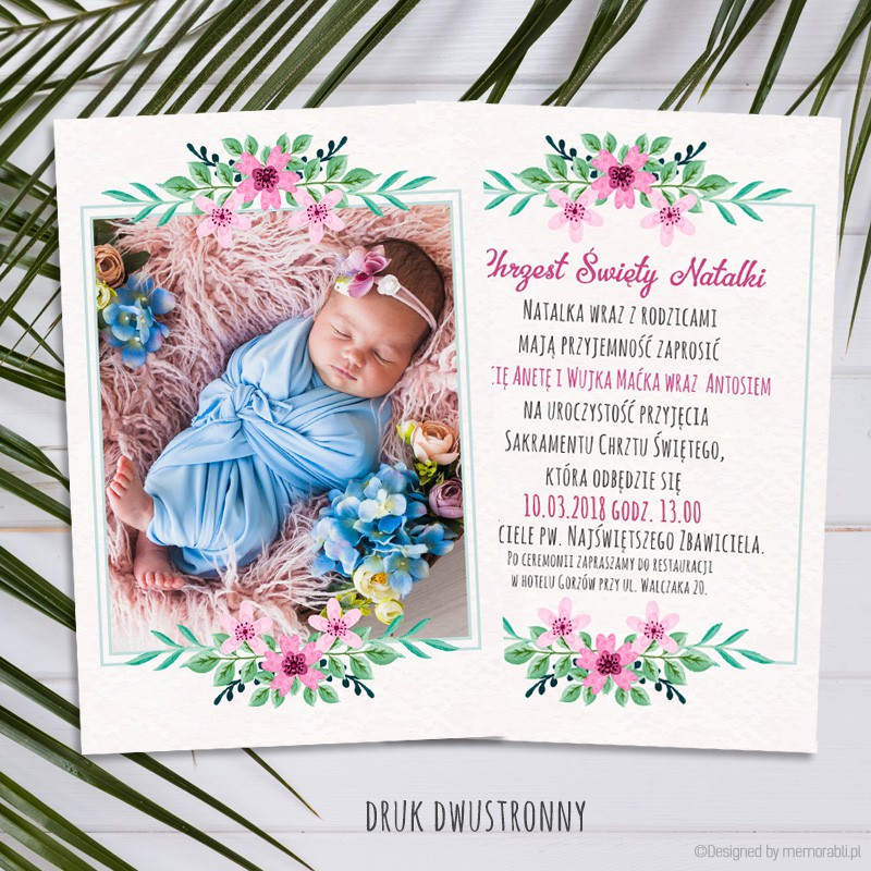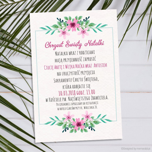 Kwiaty Różowo - Miętowe - zaproszenie na chrzest