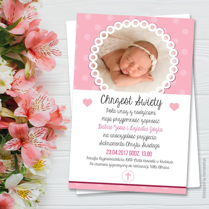 Kropki różowe ze zdjęciem - zaproszenie na chrzest