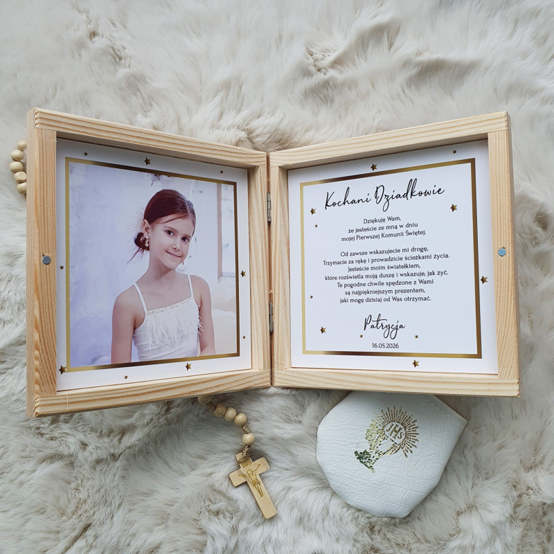 Podziękowanie KOMUNIA CHRZEST pudełko złote foto zdjęcie szkatułka