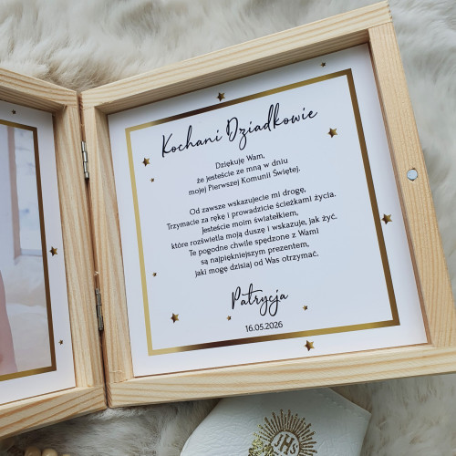 ✅ W pudełku po lewej zdjęcie dziecka, po prawej kartka z Twoim tekstem podziękowań.