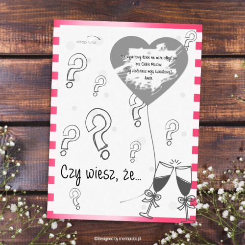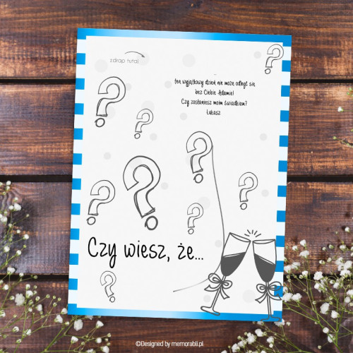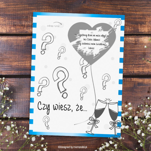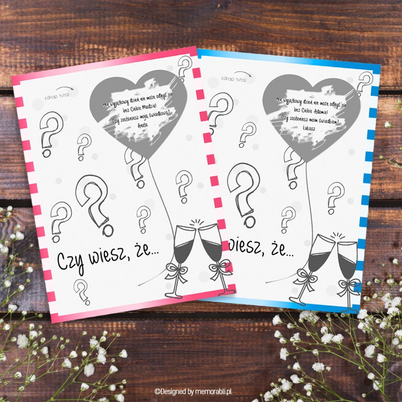 Zadaj najważniejsze pytanie bliskiej osobie w oryginalny sposób. Czy zostaniesz moją świadkową? Czy zostaniesz moim świadkiem? Spersonalizowane kartki ze zdrapką będą bardzo miłą niespodzianką dla waszych przyjaciół.