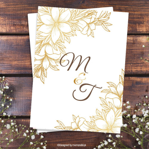 Cena 6,00 złZaproszenia ślubne ze złotymi kwiatami, druk dwustronny.