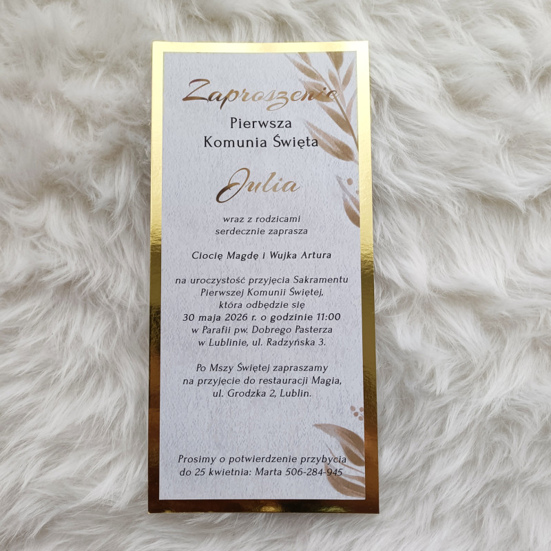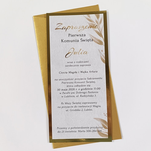 Zaproszenie złota tafla białe Pierwsza Komunia