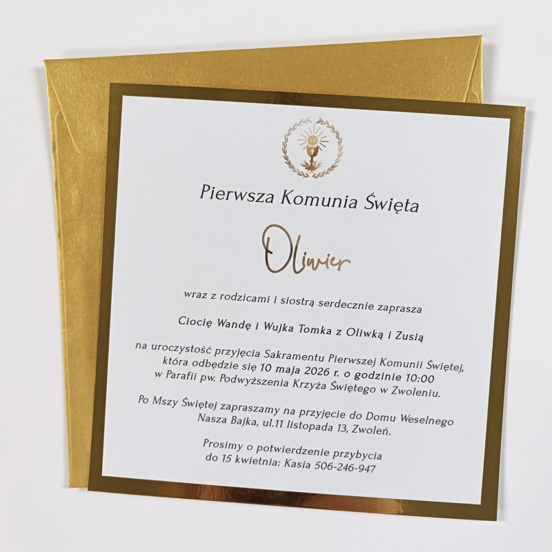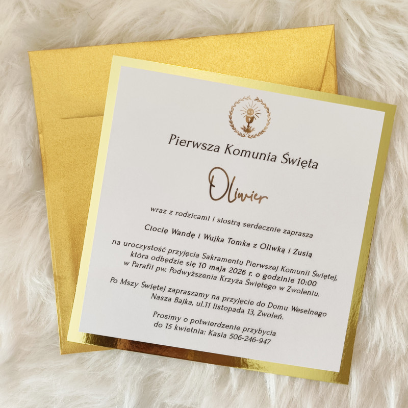 Zaproszenie złota tafla białe kwadrat Pierwsza Komunia