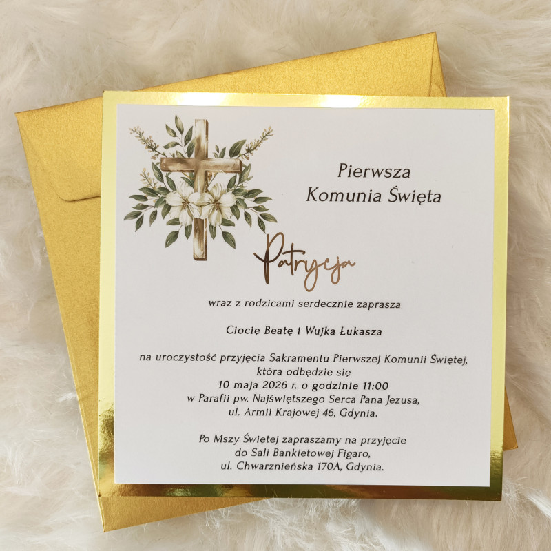 Zaproszenie złota tafla krzyż kwadrat Pierwsza Komunia