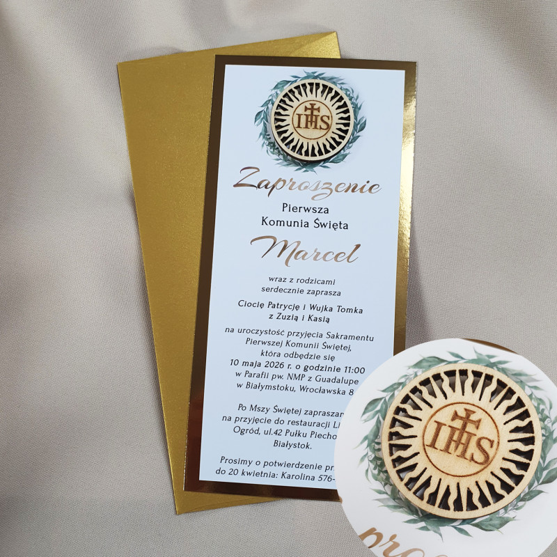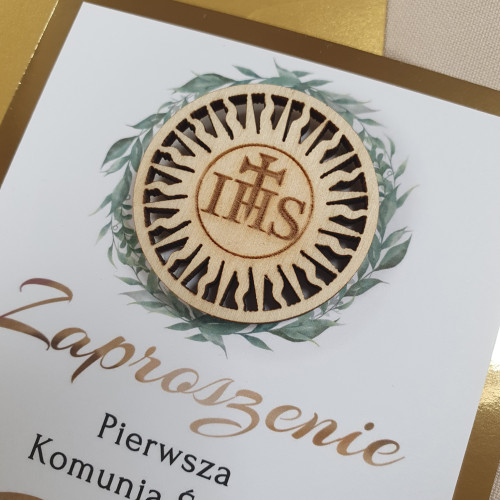 Zaproszenie złota tafla Pierwsza Komunia Hosia drewniana