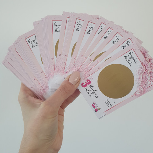 Bileciki ze zdrapkami przygotowywane są specjalnie pod Twoje wytyczne, aby całość komponowała się z Twoją marką (Twoje LOGO i KOLORYSTYKA)