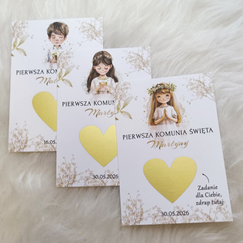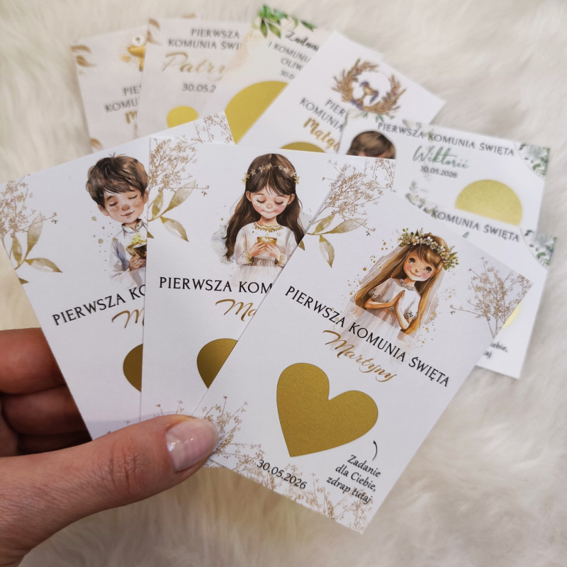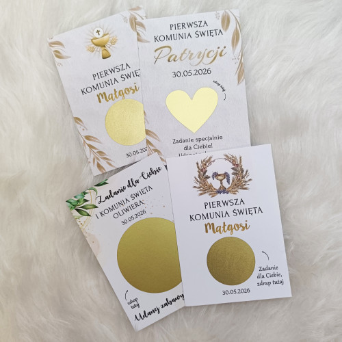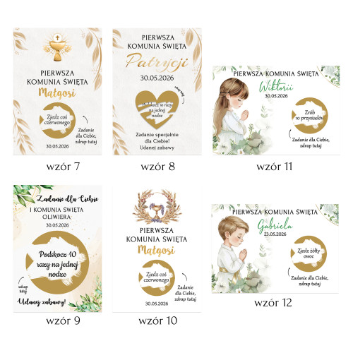 Zdrapki z zadaniami dla gości – personalizowana atrakcja na Pierwszą Komunię Świętą. To TY decydujesz, jakie zadania tam umieścimy. Wiele wzorów do wyboru.