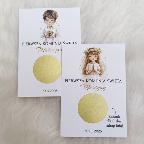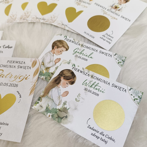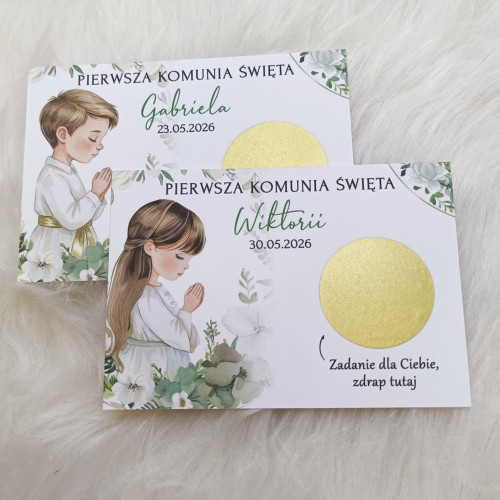 Zdrapki z zadaniami dla gości – personalizowana atrakcja na Pierwszą Komunię Świętą. Zestaw z gotowymi 18 zadaniami, (jeden wzór). Wiele wzorów do wyboru.