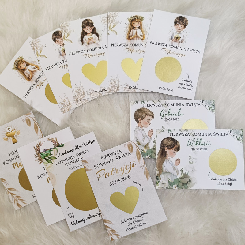 Zamień komunijne przyjęcie w pełne śmiechu, radości i wspólnej zabawy spotkanie! Personalizowane zdrapki z zadaniami to oryginalna atrakcja dla dzieci i dorosłych, która integruje gości, wywołuje uśmiech i tworzy piękne wspomnienia.
