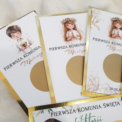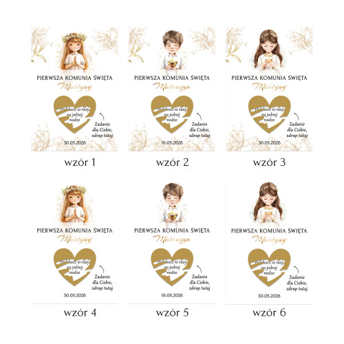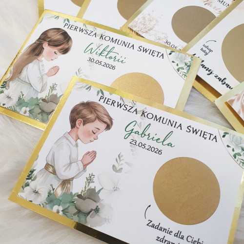 Zdrapki z zadaniami dla gości – personalizowana atrakcja na Pierwszą Komunię Świętą. Zestaw z gotowymi 18 zadaniami, (jeden wzór). Wiele wzorów do wyboru.