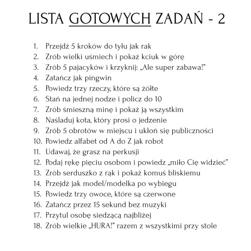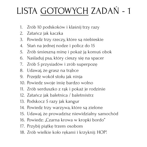 Zdrapki z naszą propozycją – 18 gotowych zadań.Przygotowaliśmy zestaw starannie dobranych, zabawnych i bezpiecznych zadań, które doskonale sprawdzą się podczas komunijnego spotkania. Zero stresu — wszystko gotowe od ręki! Zamawiając 2 zestawy dostaniesz 36 unikalnych zadań.
