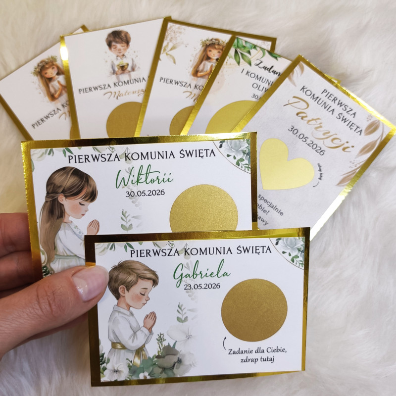 Zamień komunijne przyjęcie w pełne śmiechu, radości i wspólnej zabawy spotkanie! Personalizowane zdrapki z zadaniami to oryginalna atrakcja dla dzieci i dorosłych, która integruje gości, wywołuje uśmiech i tworzy piękne wspomnienia.