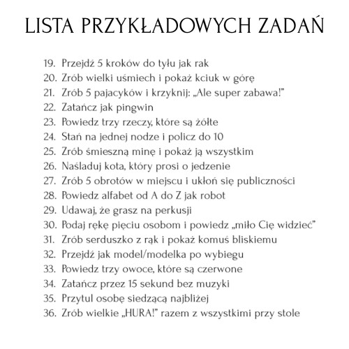 Zdrapki z Twoimi własnymi tekstami. Masz pomysł na własne zadania? Stwórz zdrapki idealnie dopasowane do Waszej rodziny, gości i charakteru przyjęcia. Ty decydujesz, jakie treści znajdą się pod zdrapką! Listę zadań wyślij na nasz adres mailowy: zamowienia@memorabli.pl.