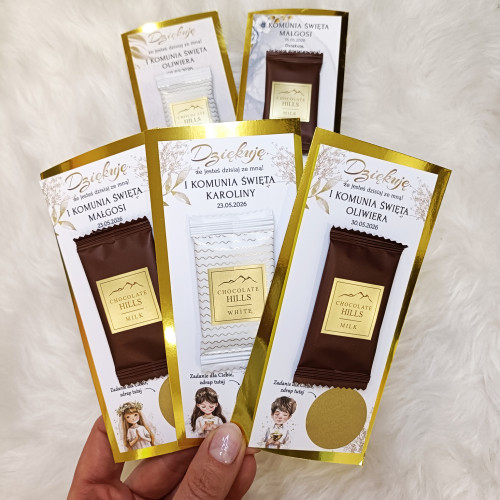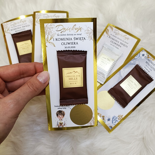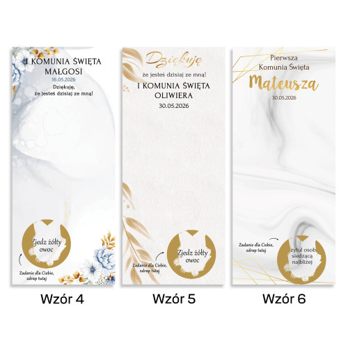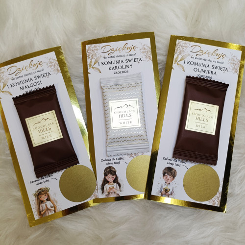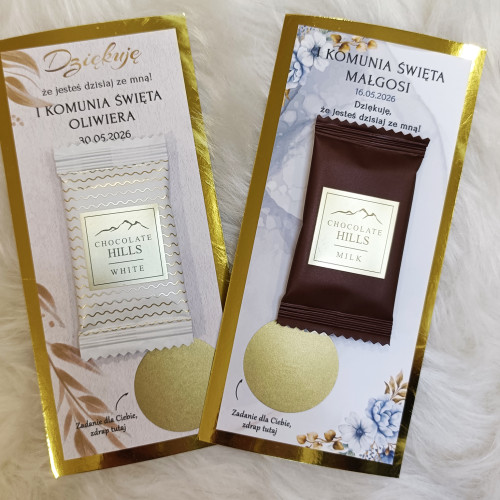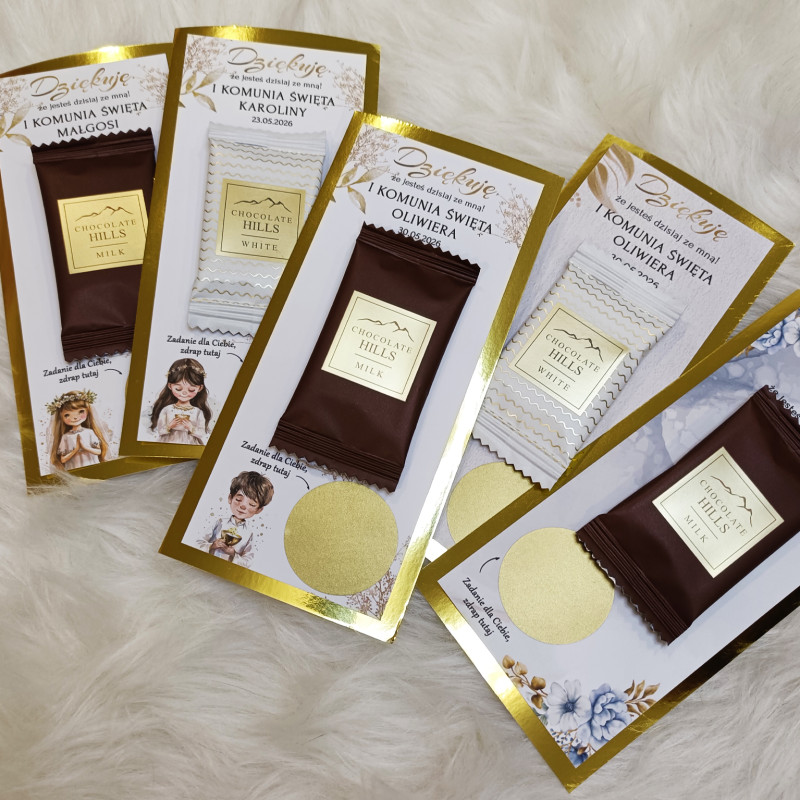 Zamień komunijne przyjęcie w pełne śmiechu, radości i wspólnej zabawy spotkanie! Personalizowane zdrapki z zadaniami to oryginalna atrakcja dla dzieci i dorosłych, która integruje gości, wywołuje uśmiech i tworzy piękne wspomnienia. Jednocześnie podziękowanie z pyszną czekoladką.