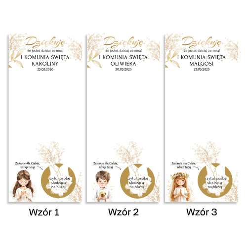 Podziękowanie Upominek Zdrapki zadania dla gości, gra Komunia Święta PREMIUM
